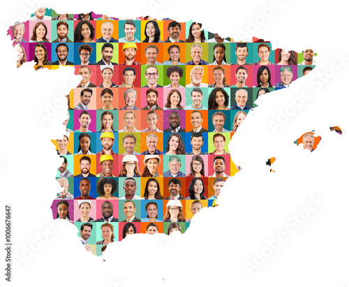 Portraits erwachsener Menschen vieler Generationen auf Landkarte von Spanien