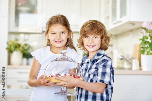 Zwei Kinder präsentieren stolz einen Obstkuchen