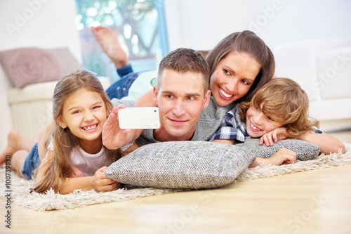 Familie mit zwei Kindern hat Spaß und macht Selfie