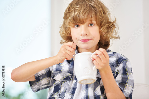 Glücklicher Junge mit einem Becher Kakao