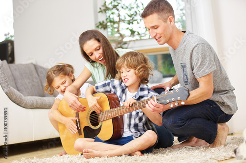 Glückliche Familie beim Musizieren mit Gitarre