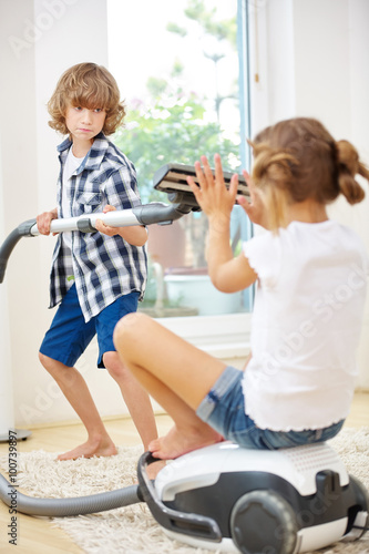 Siblings doing housecleaning with vacuum cleaner