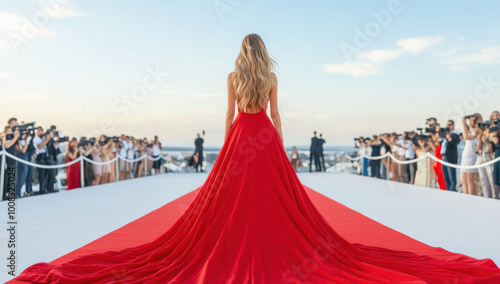 Elegant woman in a striking red dress walks confidently on a glamorous red carpet at a star-studded event, capturing attention and cameras with her poise and graceful style.