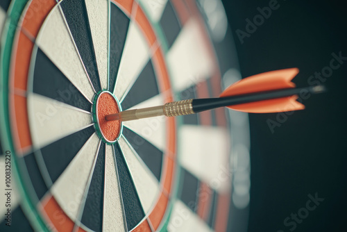 Close-up of an arrow precisely hitting the bullseye on a dartboard, signifying accuracy and success