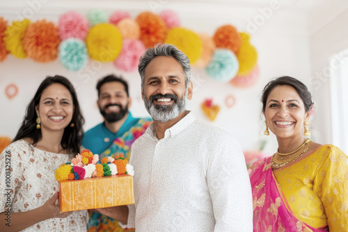 A group of four Indian friends celebrating together with vibrant colors and festive clothing, holding a decorative gift box