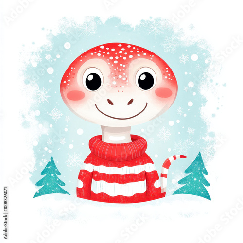 Adorable cartoon snake wearing a red and white striped sweater with a festive winter background featuring snowflakes and trees