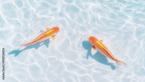 Two golden koi fish gracefully swimming in clear blue water, symbolizing tranquility and harmony in a serene aquatic environment