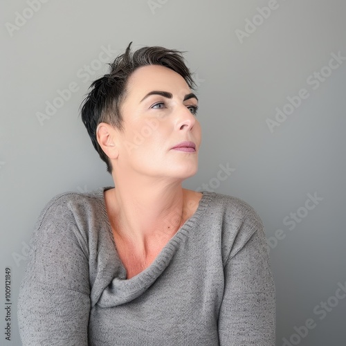 Portrait of a confident transgender person in her 40s looking thoughtfully to the side in a cozy grey sweater