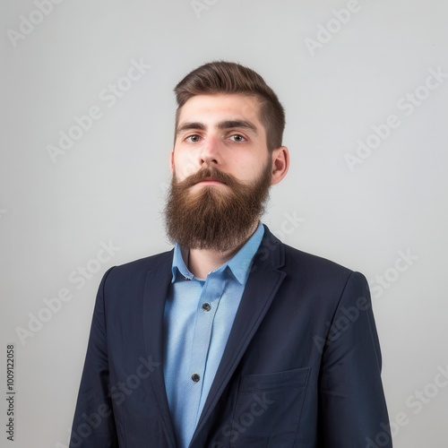 Portrait of a motivated Southeast European man in his 20s with a beard, dressed in a suit, exuding confidence and professionalism