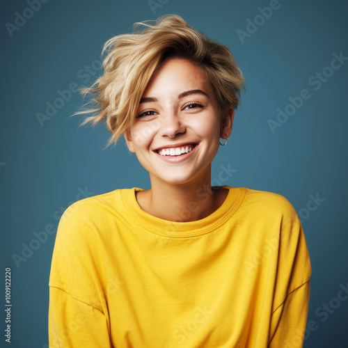 Portrait of a delighted African American woman in her 30s with short curly hair wearing a yellow jacket