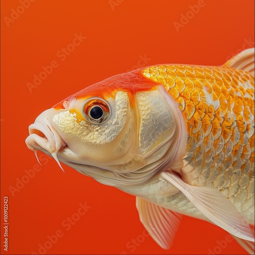 Vibrant portrait of a koi carp fish in a professional studio setting with vivid orange background highlighting its ornamental scales