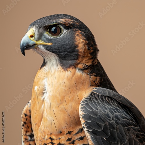 Portrait of a majestic falcon in a studio setting, showcasing its striking plumage and piercing gaze