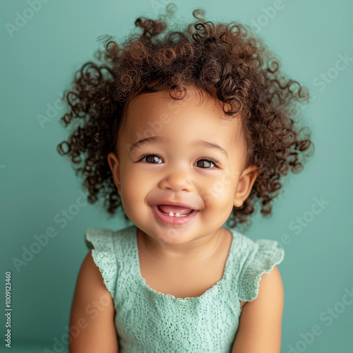 Adorable baby girl with curly hair smiling joyfully in a turquoise dress with a teal background, capturing the essence of innocence and happiness
