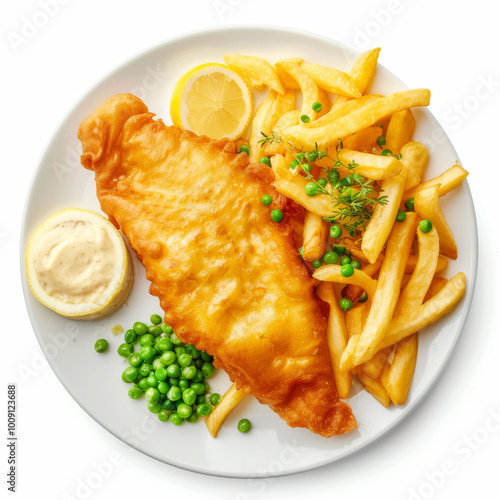 Top view of delicious beer-battered fish with french fries and peas on a plate
