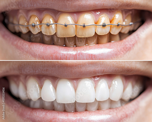 Comparison of teeth before and after orthodontic treatment highlighting dental braces and improved smile.