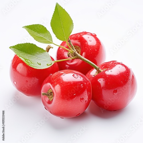 Vibrant fresh Acerola cherries with leaves and water droplets on white background