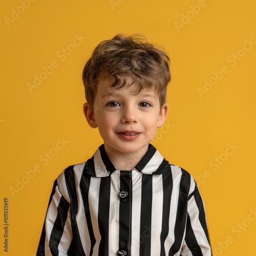 Smiling dark brown-haired child wearing a red shirt against a yellow background captured in a cheerful portrait