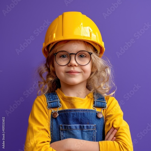 Cheerful young child in construction outfit posing confidently against a purple background