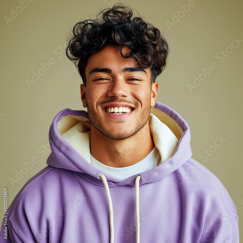 Smiling young Scandinavian man with curly black hair wearing a lavender hoodie against a neutral background
