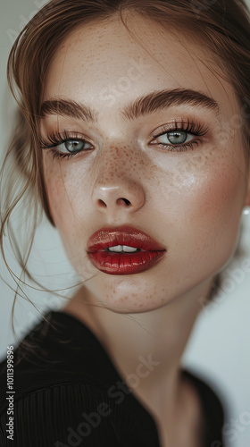Close-up of a fashion model with red lips and freckles showing natural beauty