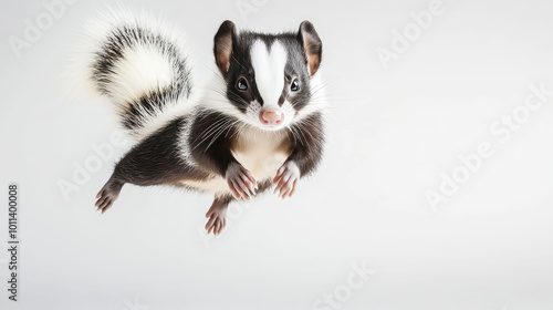 Adorable skunk floating gracefully in the sky, captured on a clean white background, showcasing the charming expression and fluffy tail of this cute animal.