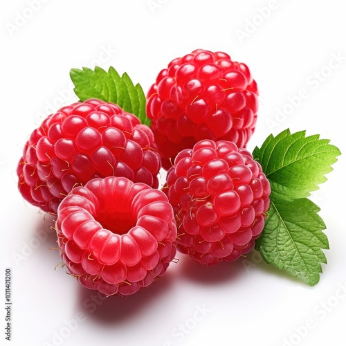 Close-up of fresh, ripe raspberries with leaves on a white background