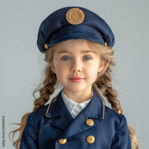 Charming child dressed as a police officer standing confidently against a vibrant blue background with a joyous expression.