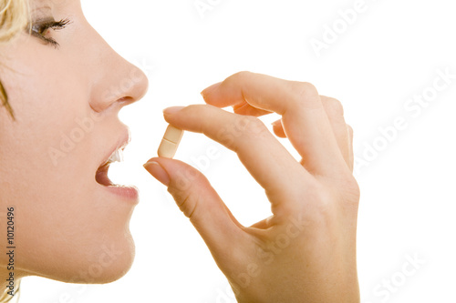 Blonde Frau hält eine Tablette vor ihrem Mund