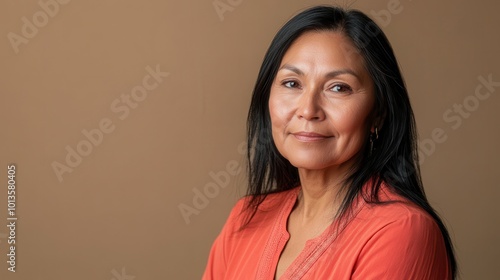 Portrait of a calm Native American woman in her 40s with medium-length hair, wearing a warm expression against a neutral background.