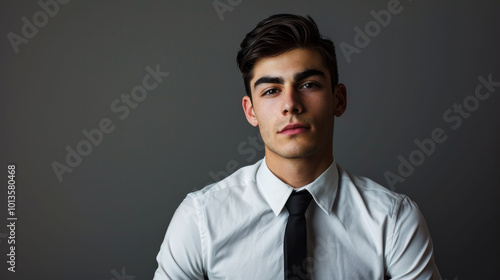 Confident young man in his 20s wearing a white shirt and tie, exuding professionalism and charisma in a studio setting