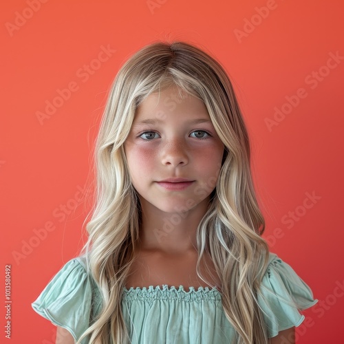 Portrait of a smiling young girl with honey blonde curls against a pastel background