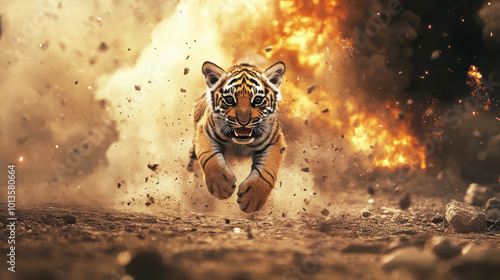 Adorable baby tiger running playfully away from a dramatic explosion background in a vivid and adventurous scene