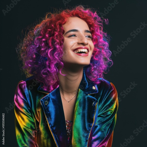 A joyful individual with vibrant rainbow-dyed curls and a radiant smile in colorful attire embodying happiness and creativity