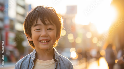 Smiling Japanese boy enjoying a sunny day outside, radiating joy and innocence