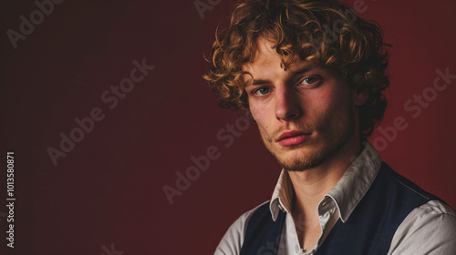 Reflective young man in his early 20s with a thoughtful expression and curly hair, wearing a white shirt and blue vest against a red background