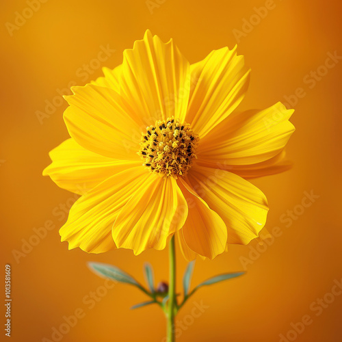 Stunning studio shot of a vibrant yellow Coreopsis flower with delicate petals on a warm orange background