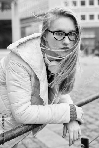 Junge Frau mit Kopfhörer schaut cool