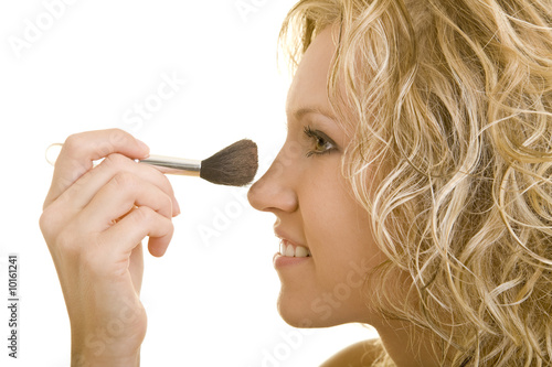 Blonde Frau pudert ihre Nase mit einem Pinsel