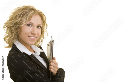 Junde blonde Frau im Jackett trägt Akten unter dem Arm