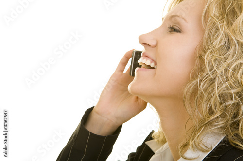 Blonde Frau in Businesskleidung telefoniert mit ihrem Handy