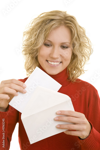Blonde Frau hält hält einen Brief und einen Briefumschlag