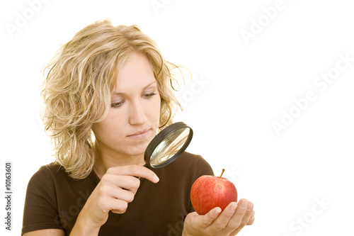 Blonde Frau betrachtet einen roten Apfel unter einer Lupe