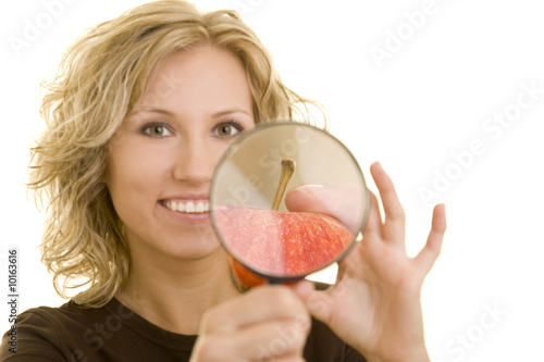 Blonde Frau betrachtet einen roten Apfel unter einer Lupe
