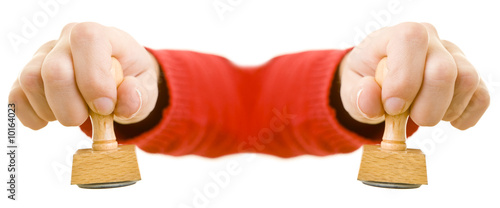 Blonde Frau um Jackett betrachtet kritisch Akten durch eine Lupe
