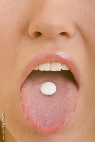Junge Frau hat eine Tablette auf der ausgestreckten Zunge liegen
