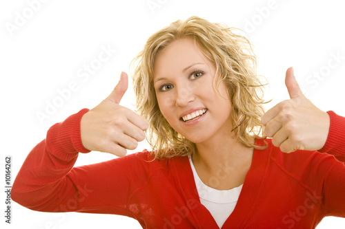Junge blonde Frau zeigt lachend mit beiden Daumen nach oben
