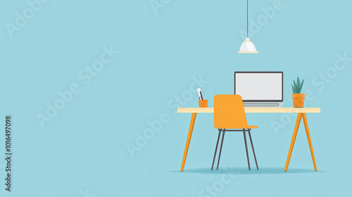 Minimalist workspace with a laptop and orange chair in a modern office setting, featuring a blue background and natural lighting for a clean and organized look