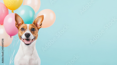 Adorable dog in a playful costume with colorful balloons against a blue background, showcasing happiness and celebration in a cheerful and festive setting.
