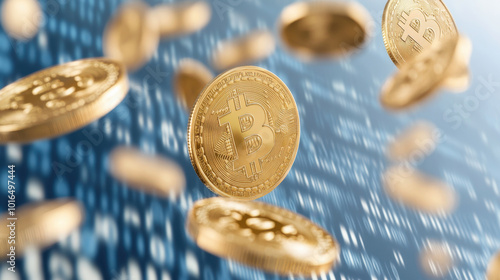 Abstract digital depiction of Bitcoin coins falling through a binary code blue background representing cryptocurrency, blockchain technology, and the future of digital finance and virtual currency