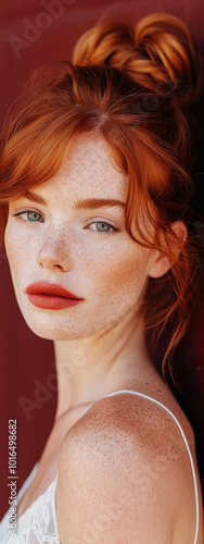 Extreme close-up of a beautiful red-haired woman with freckles and vivid lipstick